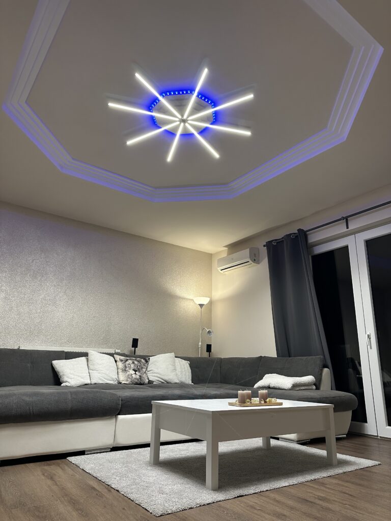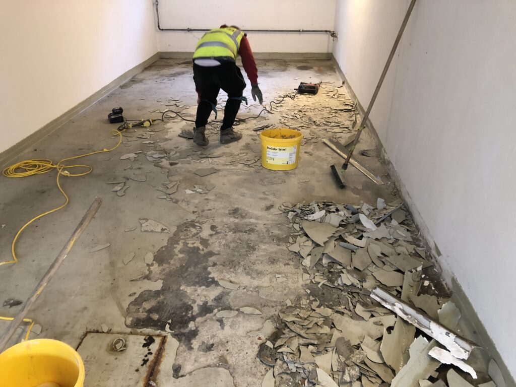 Realizace SDK podhledu se zapuštěným středem a prvky z minerálních panelů. Aplikace 1,5mm omítky a nátěr metalickou barvou, výmalba.
